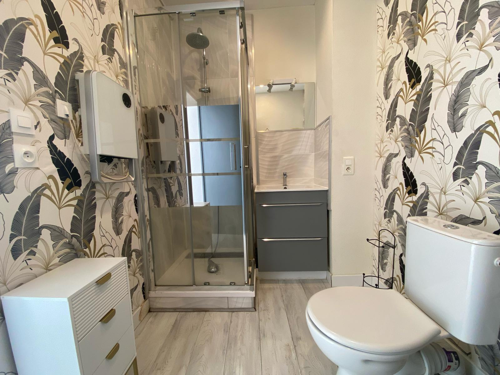Salle d’eau : Douche, meuble vasque, WC