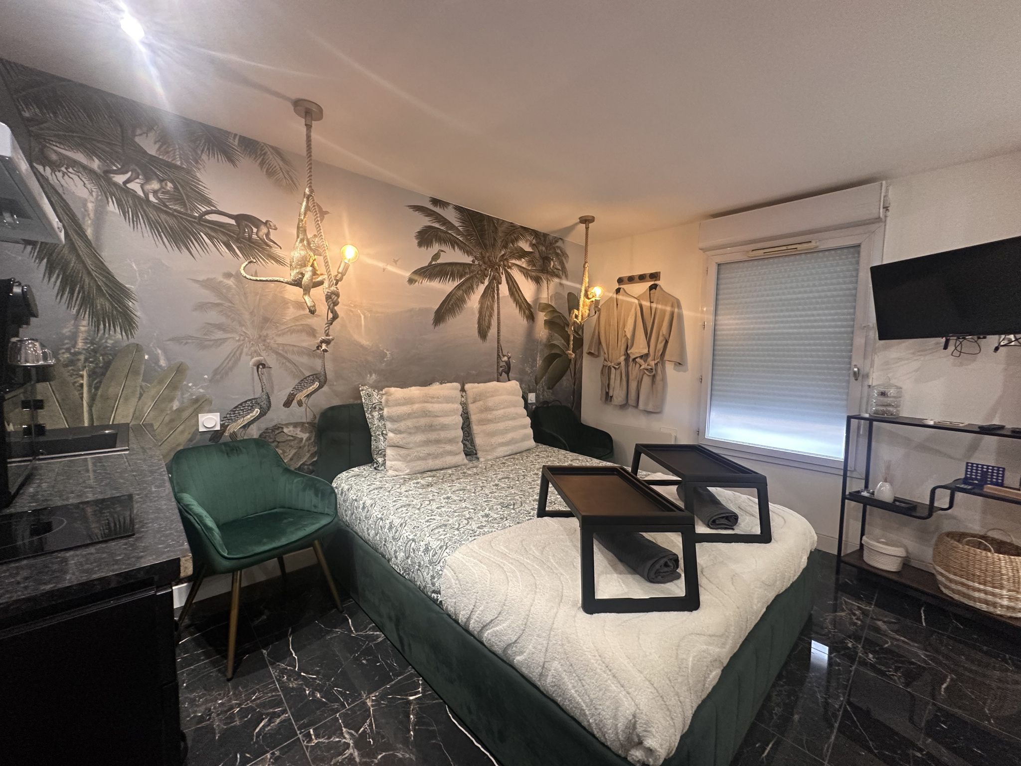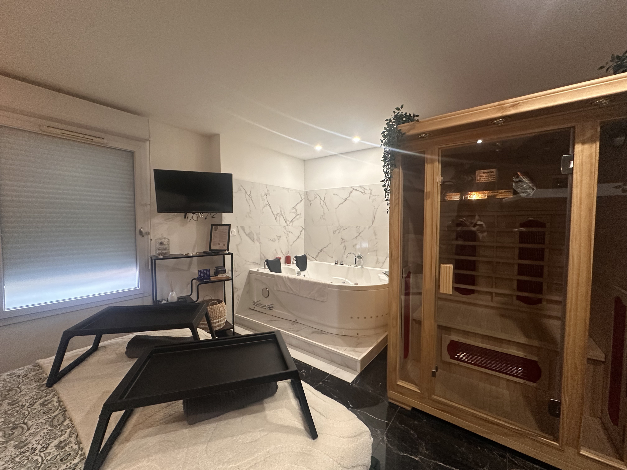 Chaque espace dispose de très jolies cuisines équipées, soigneusement aménagées pour allier confort et esthétique. Vous y trouverez également une salle d’eau avec douche et WC, ainsi que des équipements bien-être qui font toute la différence : balnéothérapie et sauna, pour une atmosphère de détente et de charme.