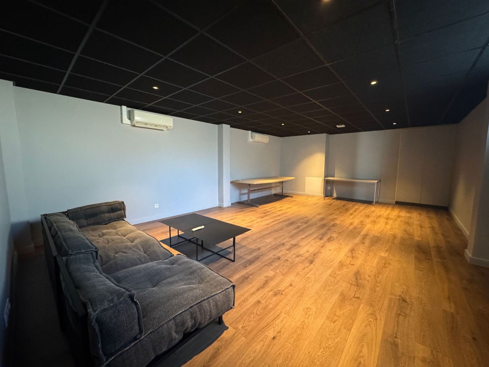 - Grand séjour lumineux, ambiance loft avec poutres apparentes et matériaux bruts